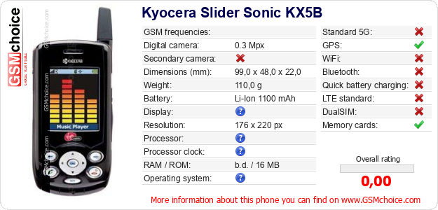 Do you have your website? Do you want to insert information about basic phone data of Kyocera Slider Sonic KX5B somewhere? It is very easy. You can download the picture, or copy and paste the code below on the page:Pasting this code will display the following image: