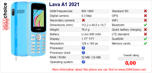Do you have your website? Do you want to insert information about basic phone data of Lava A1 2021 somewhere? It is very easy. You can download the picture, or copy and paste the code below on the page:Pasting this code will display the following image: