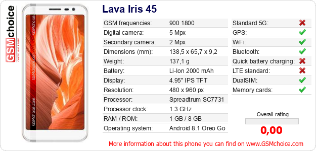 Do you have your website? Do you want to insert information about basic phone data of Lava Iris 45 somewhere? It is very easy. You can download the picture, or copy and paste the code below on the page:Pasting this code will display the following image: