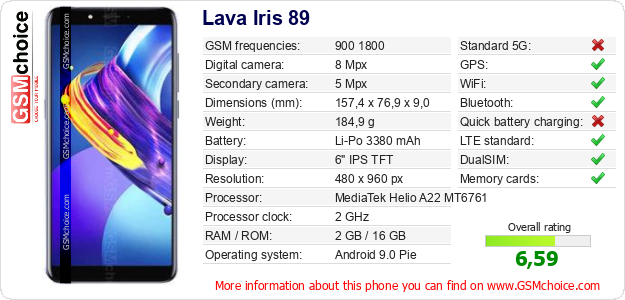 Do you have your website? Do you want to insert information about basic phone data of Lava Iris 89 somewhere? It is very easy. You can download the picture, or copy and paste the code below on the page:Pasting this code will display the following image: