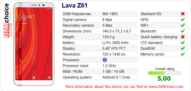 Do you have your website? Do you want to insert information about basic phone data of Lava Z61 somewhere? It is very easy. You can download the picture, or copy and paste the code below on the page:Pasting this code will display the following image: