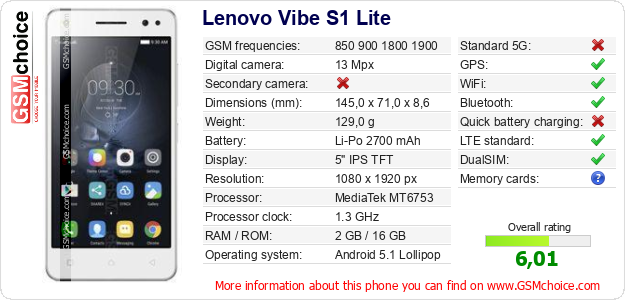 Do you have your website? Do you want to insert information about basic phone data of Lenovo Vibe S1 Lite somewhere? It is very easy. You can download the picture, or copy and paste the code below on the page:Pasting this code will display the following image: