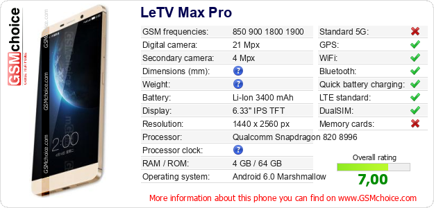 Do you have your website? Do you want to insert information about basic phone data of LeTV Max Pro somewhere? It is very easy. You can download the picture, or copy and paste the code below on the page:Pasting this code will display the following image: