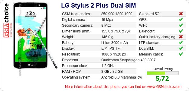 Do you have your website? Do you want to insert information about basic phone data of LG Stylus 2 Plus Dual SIM somewhere? It is very easy. You can download the picture, or copy and paste the code below on the page:Pasting this code will display the following image: