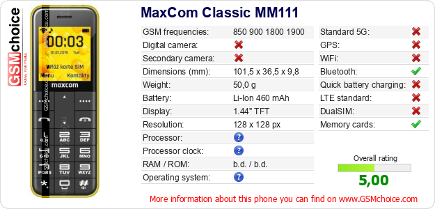 Do you have your website? Do you want to insert information about basic phone data of MaxCom Classic MM111 somewhere? It is very easy. You can download the picture, or copy and paste the code below on the page:Pasting this code will display the following image: