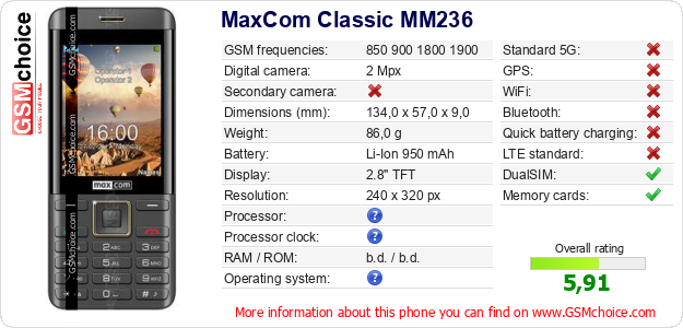 Do you have your website? Do you want to insert information about basic phone data of MaxCom Classic MM236 somewhere? It is very easy. You can download the picture, or copy and paste the code below on the page:Pasting this code will display the following image:
