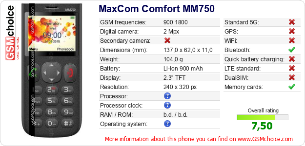 Do you have your website? Do you want to insert information about basic phone data of MaxCom Comfort MM750 somewhere? It is very easy. You can download the picture, or copy and paste the code below on the page:Pasting this code will display the following image: