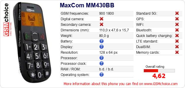 Do you have your website? Do you want to insert information about basic phone data of MaxCom MM430BB somewhere? It is very easy. You can download the picture, or copy and paste the code below on the page:Pasting this code will display the following image: