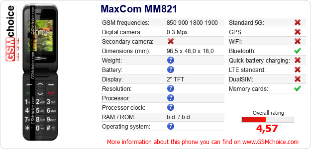 Do you have your website? Do you want to insert information about basic phone data of MaxCom MM821 somewhere? It is very easy. You can download the picture, or copy and paste the code below on the page:Pasting this code will display the following image: