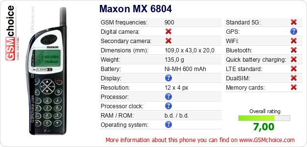 Do you have your website? Do you want to insert information about basic phone data of Maxon MX 6804 somewhere? It is very easy. You can download the picture, or copy and paste the code below on the page:Pasting this code will display the following image: