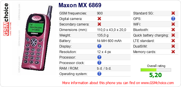 Do you have your website? Do you want to insert information about basic phone data of Maxon MX 6869 somewhere? It is very easy. You can download the picture, or copy and paste the code below on the page:Pasting this code will display the following image: