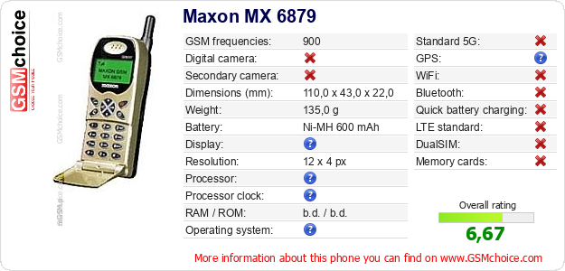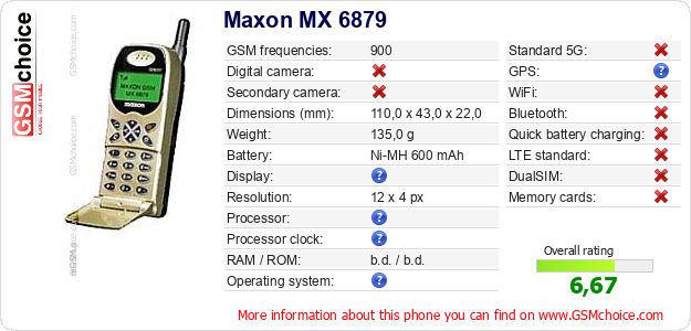 Do you have your website? Do you want to insert information about basic phone data of Maxon MX 6879 somewhere? It is very easy. You can download the picture, or copy and paste the code below on the page:Pasting this code will display the following image: