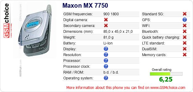 Do you have your website? Do you want to insert information about basic phone data of Maxon MX 7750 somewhere? It is very easy. You can download the picture, or copy and paste the code below on the page:Pasting this code will display the following image: