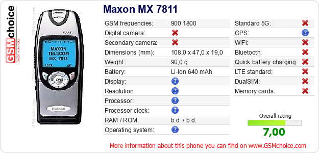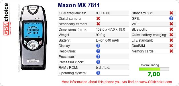 Do you have your website? Do you want to insert information about basic phone data of Maxon MX 7811 somewhere? It is very easy. You can download the picture, or copy and paste the code below on the page:Pasting this code will display the following image: