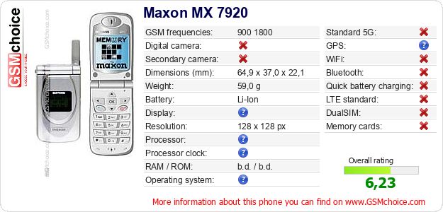 Do you have your website? Do you want to insert information about basic phone data of Maxon MX 7920 somewhere? It is very easy. You can download the picture, or copy and paste the code below on the page:Pasting this code will display the following image: