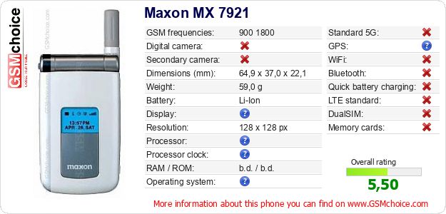 Do you have your website? Do you want to insert information about basic phone data of Maxon MX 7921 somewhere? It is very easy. You can download the picture, or copy and paste the code below on the page:Pasting this code will display the following image: