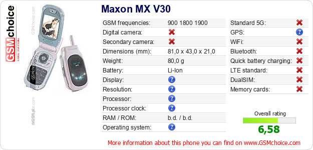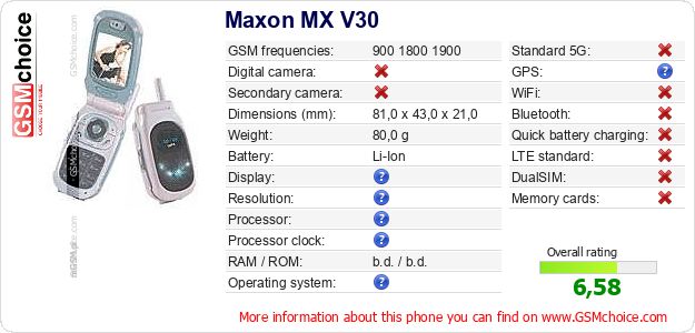 Do you have your website? Do you want to insert information about basic phone data of Maxon MX V30 somewhere? It is very easy. You can download the picture, or copy and paste the code below on the page:Pasting this code will display the following image: