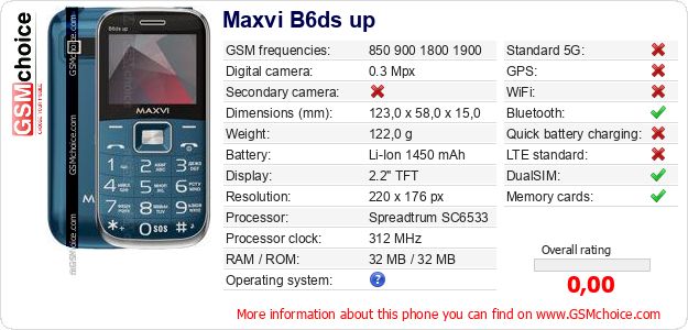 Do you have your website? Do you want to insert information about basic phone data of Maxvi B6ds up somewhere? It is very easy. You can download the picture, or copy and paste the code below on the page:Pasting this code will display the following image: