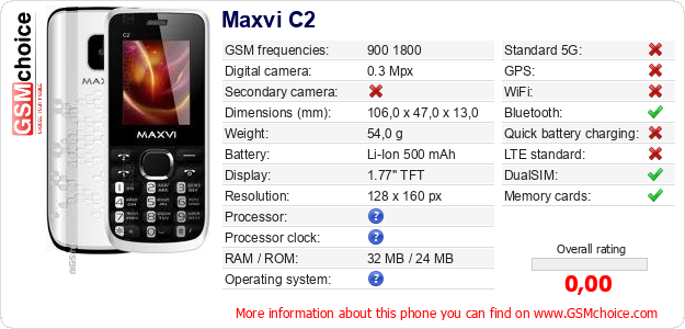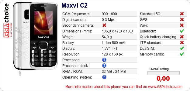 Do you have your website? Do you want to insert information about basic phone data of Maxvi C2 somewhere? It is very easy. You can download the picture, or copy and paste the code below on the page:Pasting this code will display the following image: