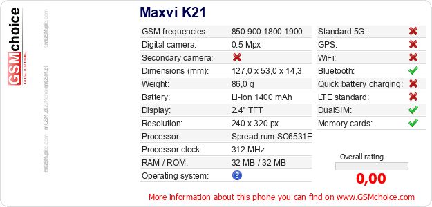 Do you have your website? Do you want to insert information about basic phone data of Maxvi K21 somewhere? It is very easy. You can download the picture, or copy and paste the code below on the page:Pasting this code will display the following image: