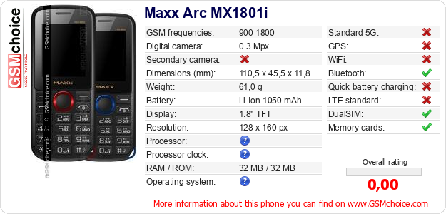 Do you have your website? Do you want to insert information about basic phone data of Maxx Arc MX1801i somewhere? It is very easy. You can download the picture, or copy and paste the code below on the page:Pasting this code will display the following image: