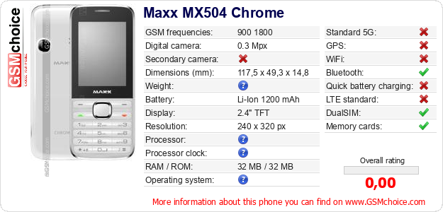 Do you have your website? Do you want to insert information about basic phone data of Maxx MX504 Chrome somewhere? It is very easy. You can download the picture, or copy and paste the code below on the page:Pasting this code will display the following image: