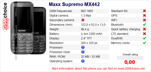 Do you have your website? Do you want to insert information about basic phone data of Maxx Supremo MX442 somewhere? It is very easy. You can download the picture, or copy and paste the code below on the page:Pasting this code will display the following image: