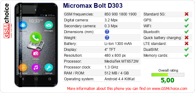 Do you have your website? Do you want to insert information about basic phone data of Micromax Bolt D303 somewhere? It is very easy. You can download the picture, or copy and paste the code below on the page:Pasting this code will display the following image: