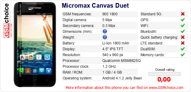 Do you have your website? Do you want to insert information about basic phone data of Micromax Canvas Duet somewhere? It is very easy. You can download the picture, or copy and paste the code below on the page:Pasting this code will display the following image: