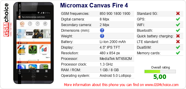 Do you have your website? Do you want to insert information about basic phone data of Micromax Canvas Fire 4 somewhere? It is very easy. You can download the picture, or copy and paste the code below on the page:Pasting this code will display the following image: