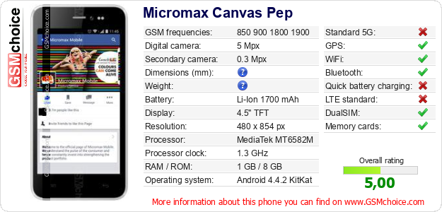 Do you have your website? Do you want to insert information about basic phone data of Micromax Canvas Pep somewhere? It is very easy. You can download the picture, or copy and paste the code below on the page:Pasting this code will display the following image: