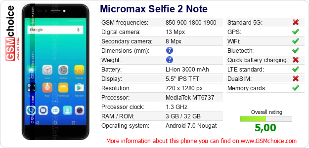 Do you have your website? Do you want to insert information about basic phone data of Micromax Selfie 2 Note somewhere? It is very easy. You can download the picture, or copy and paste the code below on the page:Pasting this code will display the following image: