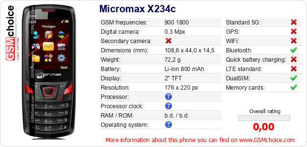 Do you have your website? Do you want to insert information about basic phone data of Micromax X234c somewhere? It is very easy. You can download the picture, or copy and paste the code below on the page:Pasting this code will display the following image: