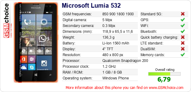 Do you have your website? Do you want to insert information about basic phone data of Microsoft Lumia 532 somewhere? It is very easy. You can download the picture, or copy and paste the code below on the page:Pasting this code will display the following image: