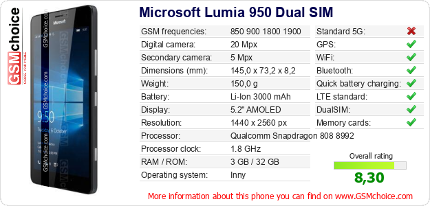 Do you have your website? Do you want to insert information about basic phone data of Microsoft Lumia 950 Dual SIM somewhere? It is very easy. You can download the picture, or copy and paste the code below on the page:Pasting this code will display the following image: