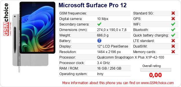 Do you have your website? Do you want to insert information about basic phone data of Microsoft Surface Pro 12 somewhere? It is very easy. You can download the picture, or copy and paste the code below on the page:Pasting this code will display the following image: