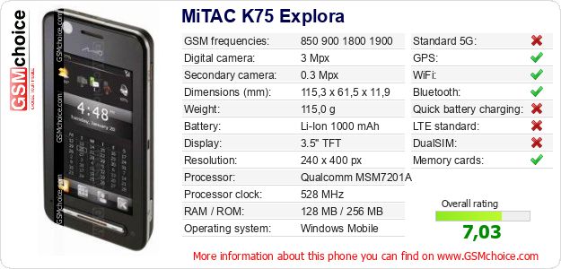Do you have your website? Do you want to insert information about basic phone data of MiTAC K75 Explora somewhere? It is very easy. You can download the picture, or copy and paste the code below on the page:Pasting this code will display the following image: