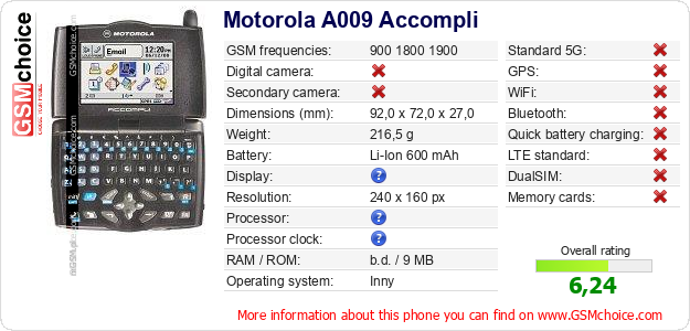Do you have your website? Do you want to insert information about basic phone data of Motorola A009 Accompli somewhere? It is very easy. You can download the picture, or copy and paste the code below on the page:Pasting this code will display the following image: