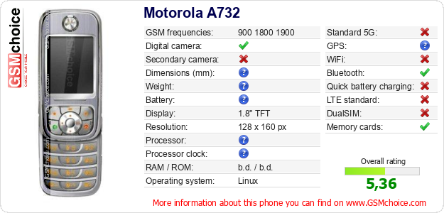 Do you have your website? Do you want to insert information about basic phone data of Motorola A732 somewhere? It is very easy. You can download the picture, or copy and paste the code below on the page:Pasting this code will display the following image: