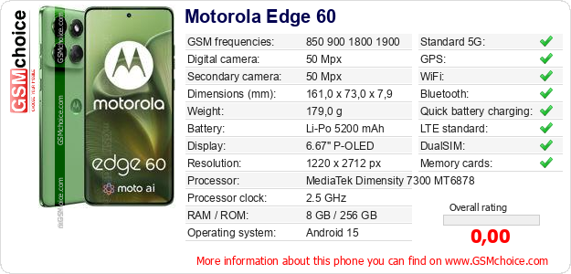 Do you have your website? Do you want to insert information about basic phone data of Motorola Edge 60 somewhere? It is very easy. You can download the picture, or copy and paste the code below on the page:Pasting this code will display the following image: