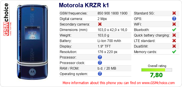Do you have your website? Do you want to insert information about basic phone data of Motorola KRZR k1 somewhere? It is very easy. You can download the picture, or copy and paste the code below on the page:Pasting this code will display the following image: