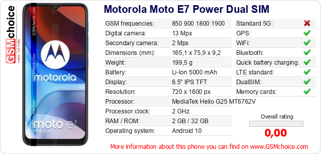 Do you have your website? Do you want to insert information about basic phone data of Motorola Moto E7 Power Dual SIM somewhere? It is very easy. You can download the picture, or copy and paste the code below on the page:Pasting this code will display the following image: