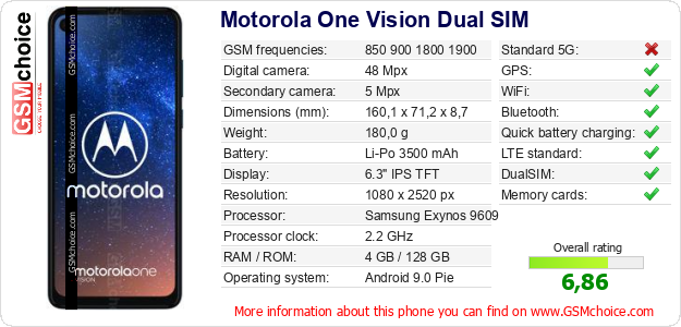 Do you have your website? Do you want to insert information about basic phone data of Motorola One Vision Dual SIM somewhere? It is very easy. You can download the picture, or copy and paste the code below on the page:Pasting this code will display the following image: