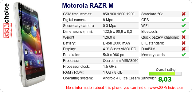 Do you have your website? Do you want to insert information about basic phone data of Motorola RAZR M somewhere? It is very easy. You can download the picture, or copy and paste the code below on the page:Pasting this code will display the following image: