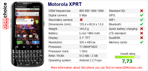 Do you have your website? Do you want to insert information about basic phone data of Motorola XPRT somewhere? It is very easy. You can download the picture, or copy and paste the code below on the page:Pasting this code will display the following image: