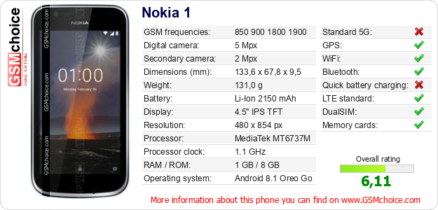 Do you have your website? Do you want to insert information about basic phone data of Nokia 1 somewhere? It is very easy. You can download the picture, or copy and paste the code below on the page:Pasting this code will display the following image:
