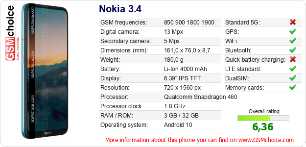 Do you have your website? Do you want to insert information about basic phone data of Nokia 3.4 somewhere? It is very easy. You can download the picture, or copy and paste the code below on the page:Pasting this code will display the following image: