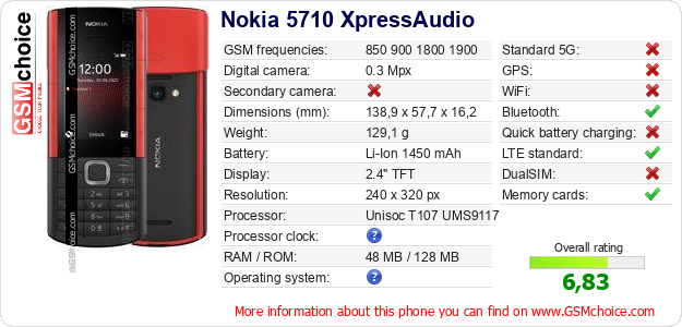 Do you have your website? Do you want to insert information about basic phone data of Nokia 5710 XpressAudio somewhere? It is very easy. You can download the picture, or copy and paste the code below on the page:Pasting this code will display the following image: