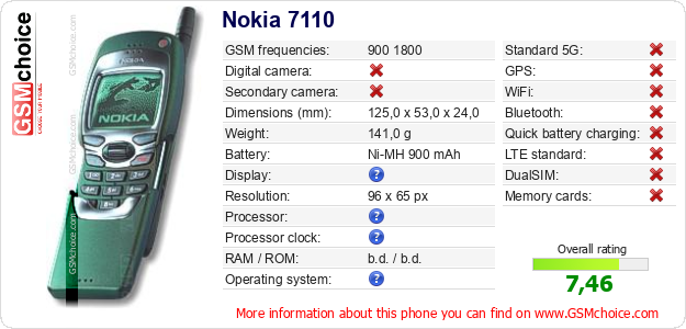 Do you have your website? Do you want to insert information about basic phone data of Nokia 7110 somewhere? It is very easy. You can download the picture, or copy and paste the code below on the page:Pasting this code will display the following image: