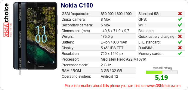 Do you have your website? Do you want to insert information about basic phone data of Nokia C100 somewhere? It is very easy. You can download the picture, or copy and paste the code below on the page:Pasting this code will display the following image: